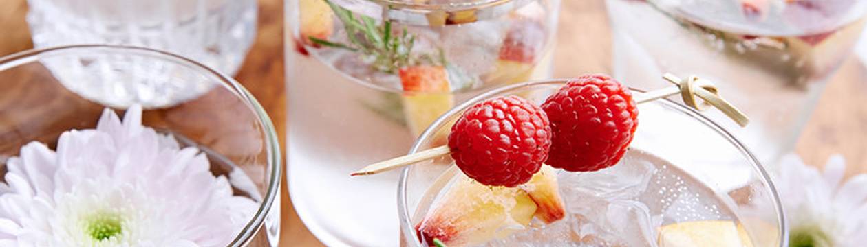 Strain into a glass filled with ice, top with soda water and garnish with raspberries.