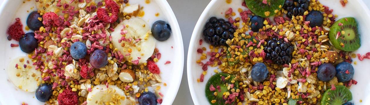 Pour the yoghurt into a bowl, place the slices of banana or kiwi on top, sprinkle granola or oats on top, sprinkle with seeds and bee pollen and finally top with berries!