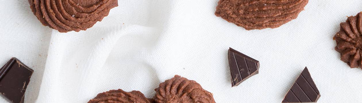 Cream the butter, sugar and vanilla seeds together, sift in half of the flour, and cacao powder, add a pinch of salt and combine. Mix in the egg whites, then add the remaining flour and cacao powder and mix.