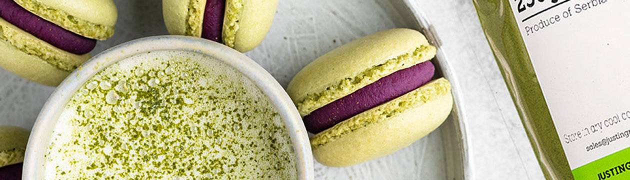 Preheat the oven to 150C. Sift the flour, icing sugar and matcha into a mixing bowl then sift in a second time. In a separate bowl, whisk together the egg whites and sugar. Beat until a meringue consistency forms.