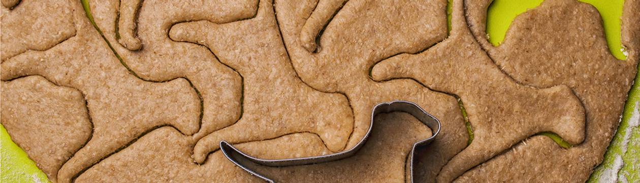 Lightly dust a clean work surface with flour and roll out the dough until it's 1/4 inch thick. Use a cookie cutter to cut out shapes and place the treats onto a baking tray lined with baking paper.