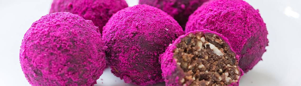 Roll the mixture in to balls and roll in to beetroot powder to coat with a pink layer. You can also coat in desiccated coconut!