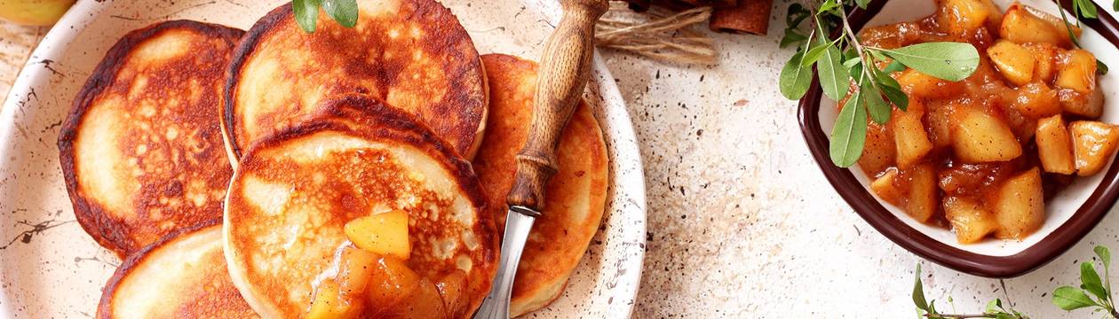 Fluffy spiced pancakes with ooey gooey apple topping!