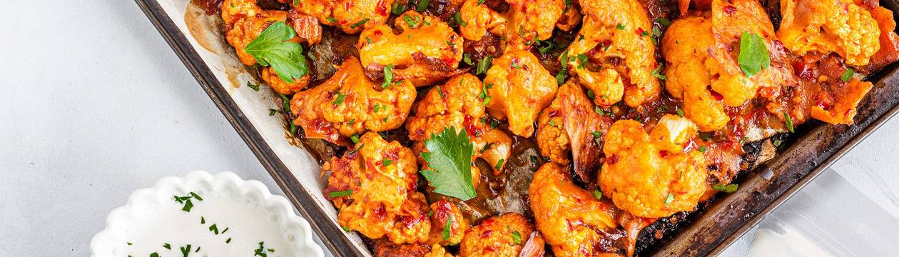 In a bowl, combine the barbecue sauce and sriracha, place the cauliflower wings into a large bowl and pour the sauce on top. Mix until evenly coated. Place the florets back on to the baking tray and bake for 20 minutes.