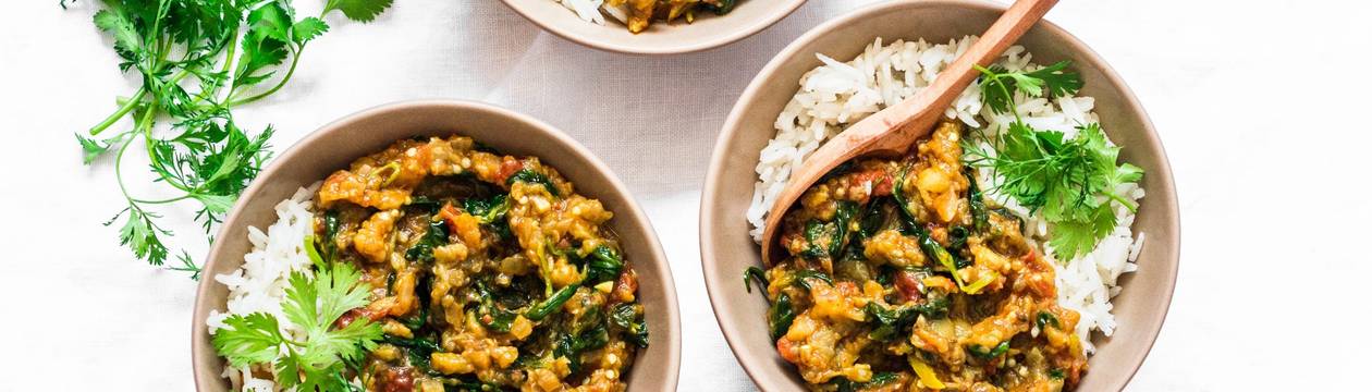 Boil or steam the kale for a couple of minutes while sauteing the onion and eggplant. Stir in the curry powder, heat for one minute then stir in the tomatoes and chickpeas with 100ml of water. Bring to a boil, cover and simmer for 5 to 10 minutes. Add the kale and spinach until wilted and serve with rice.
