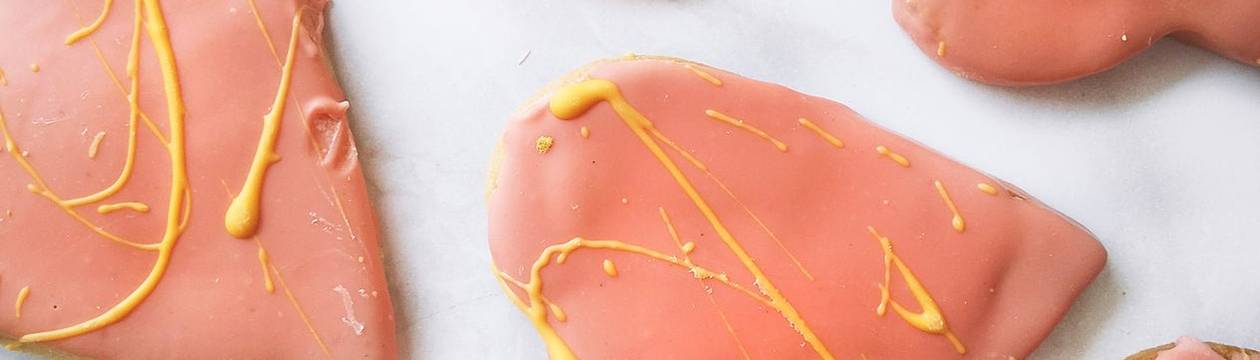 Leave the biscuits to cool on a cooling rack. Stir the icing sugar, rosewater, water and pink colouring together. Use to ice the biscuits (see picture). Create a small batch of icing but this time use yellow colouring and splash over the biscuits (see picture).