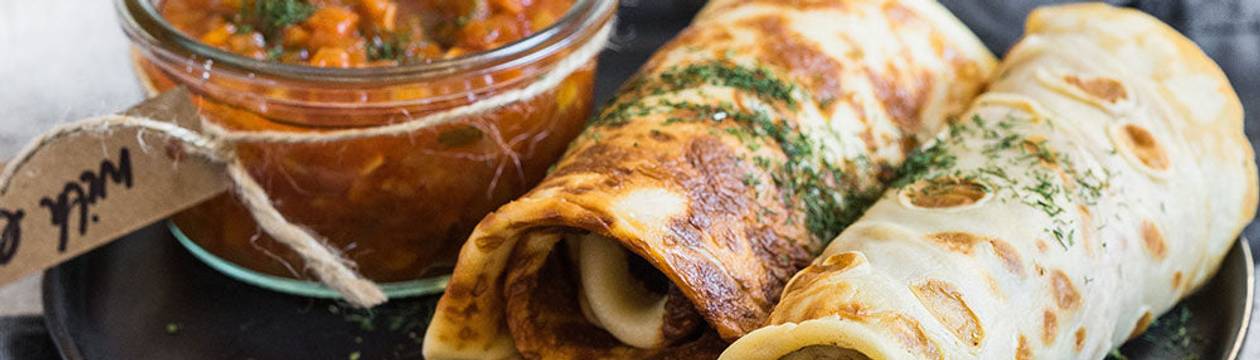 Heat some oil in a frying pan, add the batter, swirl around the pan until evenly coated, cook until golden brown, flip and cook until golden brown. Repeat for the remaining batter and serve a long side the chutney.