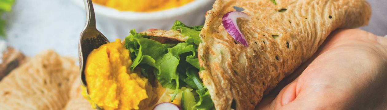 Spread the hummus on to a tortilla, add slices of cucumber, the mixed greens, tomato slices, avocado and onion. Fold the wrap tightly and tuck in!