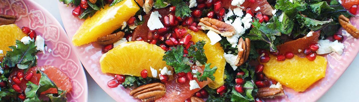 Place the kale in a serving bowl, top with segments of fruit, sprinkle chopped pecans, pomegranate and crumble plant-based feta cheese on top.