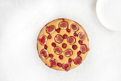 A simple sponge cake topped with fresh figs and raspberries.
